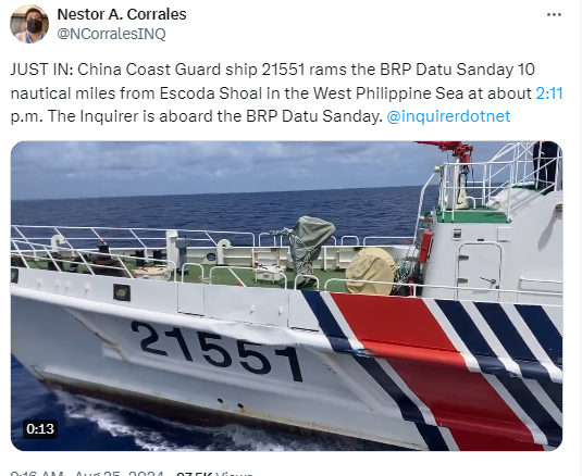 Filippiinien kalastus- ja vesiresurssien viraston (BFAR) alus joutui sunnuntaina (25.08.) Länsi-Filipiinien merellä (WPS) Escoda Shoal -matalikon (Sabina Shoal) lähellä Kiinan rannikkovartioston (CCG) häirinnän kohteeksi. Inquirerin mukaan (videolla) CCG Ship 21551 ajoi tahallisesti päin Filippiinien BRP Datu Sanday:tä. Filippiiniläis-aluksen miehistön kuvaamaa videota alempana.