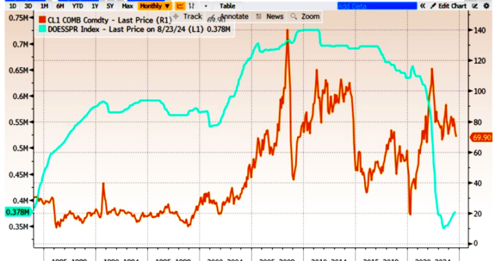 Yhdysvaltain polttoaine-varannot on päästetty vaarallisen vähiin, millä saattaa olla myös markkinavaikutuksia. Öljyreservin määrä on nyt tasolla, jolla oltiin viimeksi vuonna 1984. https://x.com/LLequeu/status/1831626896465182813 Laurent Lequeu 05.09. 2024: At the same time, the US has never been more vulnerable to an external oil shock, with its Strategic Petroleum Reserves at their lowest level since 1984 Luettavaa: https://www.eia.gov/petroleum/supply/weekly/, … Jatka artikkelin Yhdysvaltain strategiset öljyreservit vaarallisen alhaalla lukemista