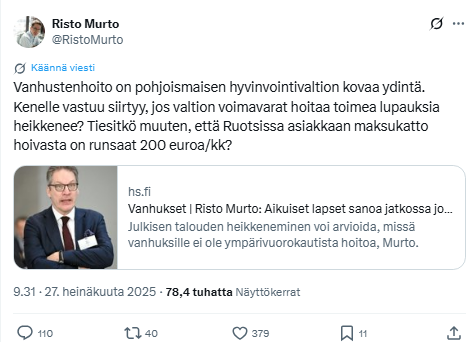 Työeläkevakuutusyhtiö Varman toimitusjohtaja Risto Murto on tuonut julkisuuteen ajatuksen, joka on käynyt mielessä varmasti monella muullakin. Murron mukaan keskustelu lasten aiempaa suuremmasta vastuusta vanhempiensa hoidossa tulee akuutiksi kymmenen vuoden sisällä, jos valtion rahoituspohja edelleen murenee. (Uudenkaupungin Sanomat 02.08. 2025.)