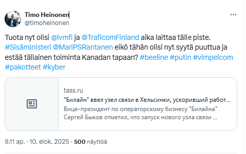 Kansanedustaja Timo Heinonen (Kokoomus) kysyy tänään viestipalvelu X:ssä sisäministeriltä suhtautumista venäläisen teleoperaattorin maihinnousuun Helsinkiin.