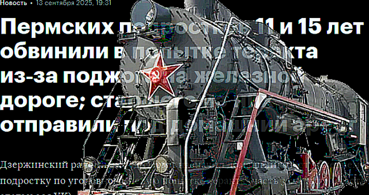 Kaksi teini-ikäistä on tuomittu naapurissamme Venäjällä terroriteon yrityksestä, heidän tehtyään jotain rautatien vahingoittamiseksi. Permin piirikunnan Dzeržinskin piirioikeus on tuominnut 15-vuotiaan teini-ikäisen kotiarestiin terrori-iskun yritystä koskevassa rikosasiassa (rikoslain 30 §:n 3 momentti, 205 §:n 2 momentti), tuomioistuimen lehdistöpalvelu kertoi . Oikeuden raportista käy ilmi, että tapauksessa on toinen vastaaja, joka on vasta 11-vuotias. Hänet jätettiin vapaaksi, … Jatka artikkelin Normipäivä Venäjällä: 11- ja 15-vuotiaat tuomittu terrori-iskun yrityksestä lukemista