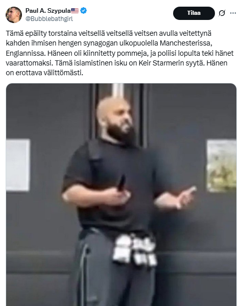 Heaton Parkin heprealaisen seurakunnan synagoga Crumpsallissa. pohjoisessa Manchesterissa, joutui tänään väkivaltaisen hyökkäyksen kohteeksi. Kaksi henkilöä kuoli synagogan edustalla, ja neljä loukkaantui auton ajaessa kohti ihmisjoukkoa, -ja sen jälkeisessä puukotuksessa.