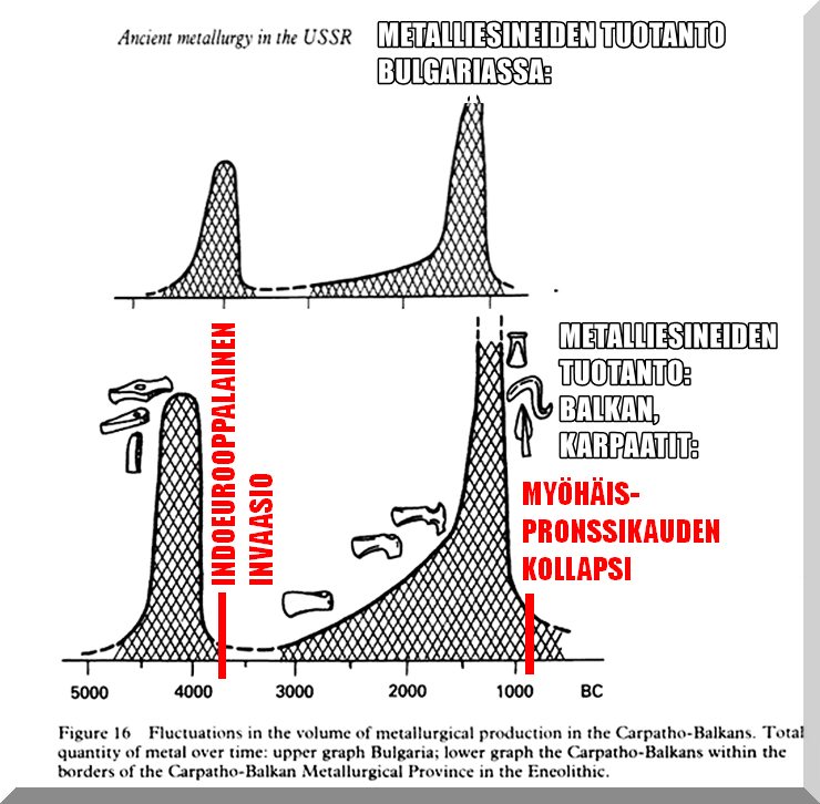 Alla olevan grafiikan ajoitukset ovat kalibroimattomia, -vanhoilla menetelmillä- mutta romahduksen syvyys näkyy dramaattisena sekä indoeurooppalaisen invaasion, että myöhäis-pronssikauden kollapsin (”merikansat” Egyptiin) kohdalla.