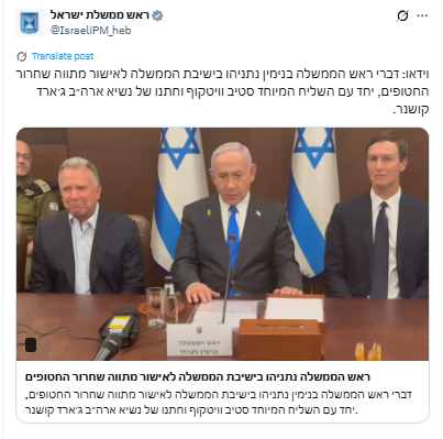 Trumpin avustajat Witkoff ja Kushner osallistuivat molemmat hallituksen kokoukseen (?!!). Kushnerin mukaan Netanjahu ”teki todella uskomatonta työtä tässä asiassa ja teki loistavaa työtä neuvotteluissa”.