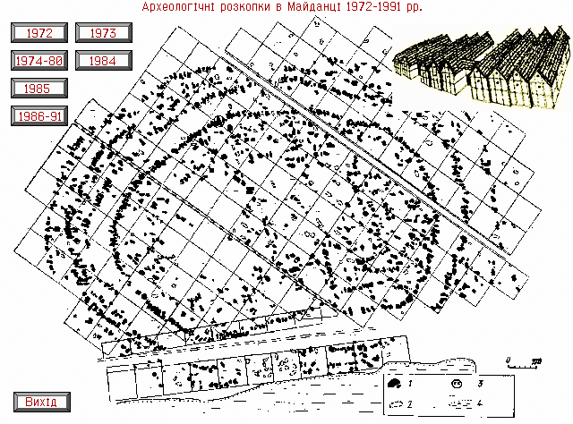 Nämä teorioihin sopimattomat muinaiskaupungit löydettiin Ukrainasta, ja ne hämmästyttivät heti koollaan. Maidanetsissa (alla) lasketaan olleen 46 000 asukasta. Pinta-alaa 270 hehtaaria. Mustat merkinnät (1.) tarkoittavat asuttujen talojen pohjia.