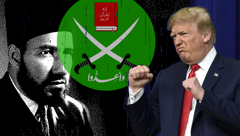(Kuva: Hassan al-Banna -vasemmalla, Muslim Brotherhoodin tunnus. Trump.)