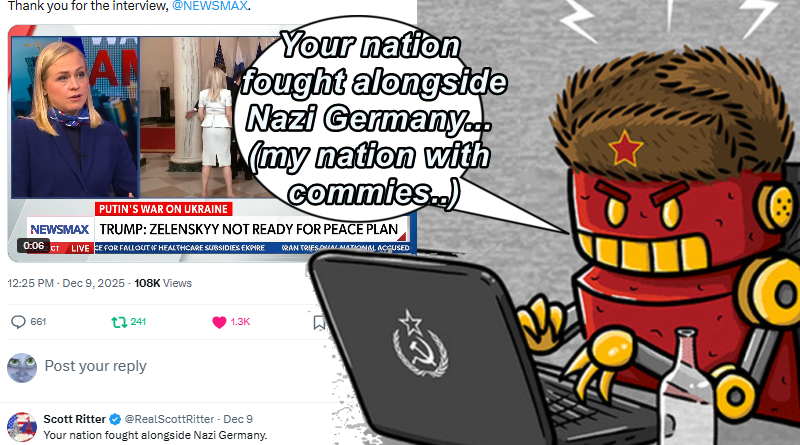 Esimerkkitapauksemme somettaja, joku Scott Ritter, lienee entinen US.Armyn kapiainen, -erotettu syistä jotka ovat yksityisyyden suojan alla- ”vastaa” Suomen ulkoministerille, Elina Valtoselle, argumentein, joista mahorkan katku tulee vinkeänä läpi.