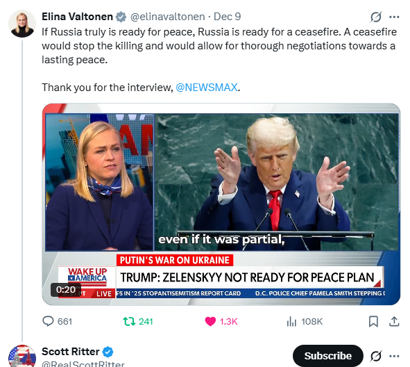 Elina Valtonen 09.12. 2025: If Russia truly is ready for peace, Russia is ready for a ceasefire. A ceasefire would stop the killing and would allow for thorough negotiations towards a lasting peace.