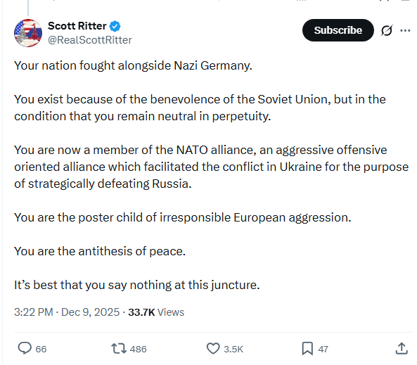 Scott Ritter vastasi viestipalvelu X:ssä ulkoministerille samana päivänä: