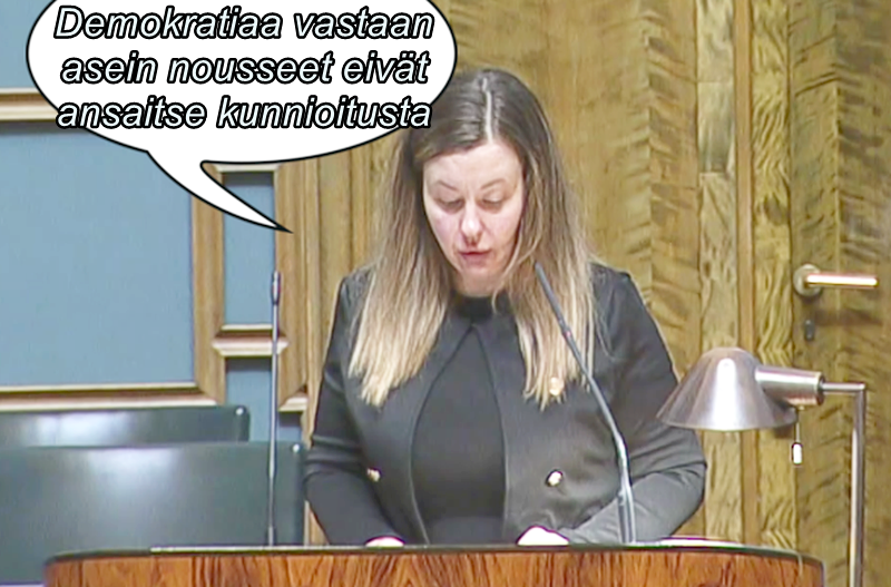 Kansanedustaja Sanna Antikainen (Perussuomalaiset) viittaa ehdotukseen, jonka mukaan eduskunnan tulisi osoittaa kunnioitusta yli kolmellekymmenelle entiselle kansanedustajalle, joista merkittävä osa osallistui vuoden 1918 Vapaussodan aloittaneeseen väkivaltaiseen vallankumoukseen ja pakeni Neuvostoliittoon vältelläkseen vastuuta teoistaan.