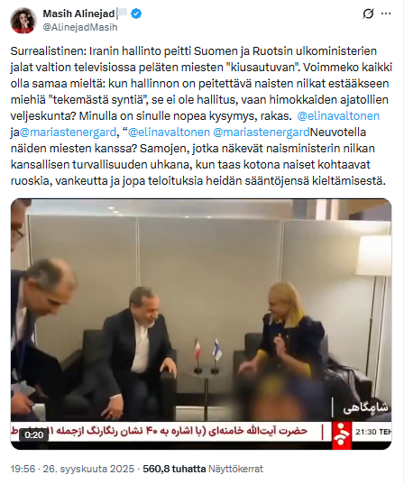 Masih Alinejad 26.09. 2026: Surreal: Iran’s regime covered the legs of Finland & Sweden’s foreign ministers on State TV, afraid their men would be “tempted.” Can we all agree: when a regime needs to hide women’s ankles to keep men from ‘sinning,’ they’re not a government, they’re a frat house of horny ayatollahs? I have a quick question to you dear @elinavaltonen and @mariastenergard. Negotiate with these men? The same ones who see a female minister’s ankle as a national-security threat while women at home face lashes, imprisonment, and even execution for refusing their rules.