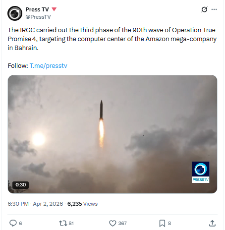 Iranin vallankumouskaarti (IRGC) ilmoitti hyökänneensä Amazonin pilvipalvelukeskukseen Bahrainissa, kertoo Iranin IRNA-uutistoimisto. Press TV:n mukaan Iranin vallankumouskaarti toteutti operaatio True Promise 4:n 90. aallon kolmannen vaiheen.