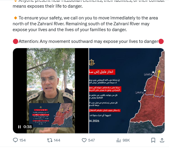 Puolustusarmeija jatkaa operaatioitaan Hizbollahin terroristitoimintaa vastaan ​​voimalla kyseisellä alueella eikä sillä ole aikomusta vahingoittaa teitä”, tiedottaa IDF (08.04. 2026).